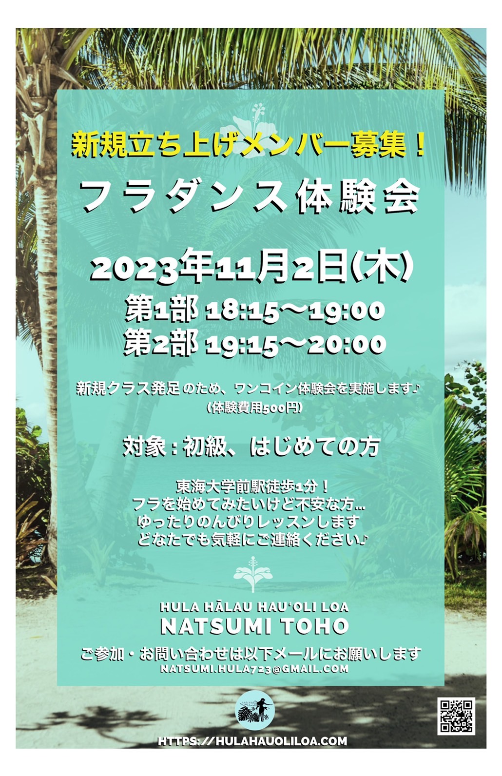 こちらの体験予約ページもしくはnatsumi.hula723@gmail.comまでご連絡下さい。